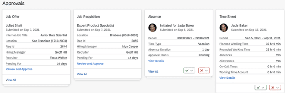 Users can approve Employee Central workflows directly from cards in the Approvals section, with or without adding comments.